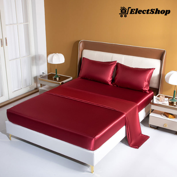 Conjunto LuxPink - Jogo de Capa de Colchão + Lençol em Cetim de Seda + Fronhas - Electshop